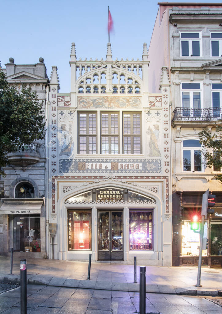 O edifício, projetado por Francisco Xavier Esteves, apresenta um interior neo-gótico com madeira entalhada, colunas esguias e uma claraboia de vidro colorido. A sua escadaria vermelha escultural liga os dois pisos principais e tornou-se a caraterística mais reconhecível da livraria.